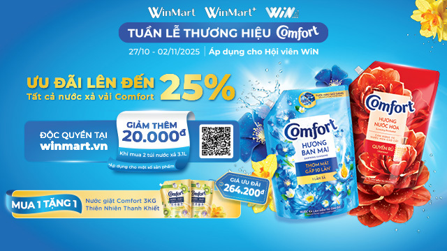 Đặc biệt, WinMart dành tặng cho Quý khách mã giảm giá thêm 20.000Đ áp dụng khi mua đơn hàng từ 239.000Đ gồm 2 sản phẩm Comfort bất kỳ.